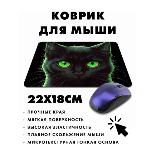Коврик для мыши с изображением кошки сочетает в себе стиль и функциональность. Он станет отличным дополнением рабочего стола, добавляя уют и атмосферу. Прорезиненная основа обеспечивает надежное сцепление с поверхностью, предотвращая скольжение коврика во время работы.