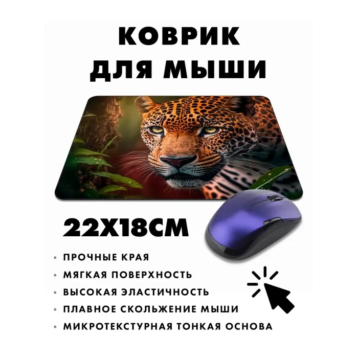 Коврик для мыши с изображением леопарда — это не только практичный, но и стильный аксессуар для рабочего места. Он придаёт индивидуальность и яркость любому интерьеру, а также символизирует силу и грацию. Прорезиненная основа обеспечивает надежное сцепление с поверхностью стола, предотвращая скольжение коврика во время работы.