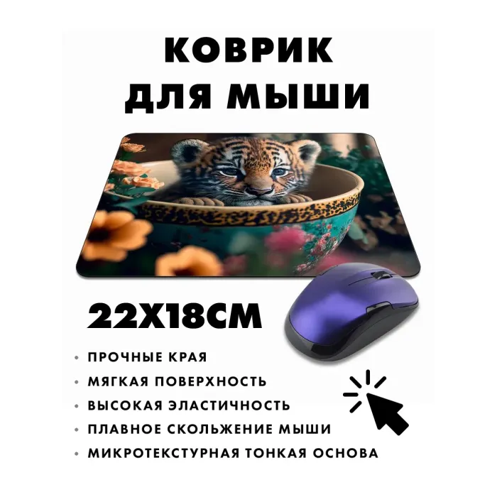 Коврик для мыши с изображением тигрёнка — это не только практичный аксессуар, но и стильный элемент рабочего пространства. Он обладает прорезиненной основой, что обеспечивает надежное сцепление с поверхностью и предотвращает скольжение. Размер коврика составляет 22х18 см, а толщина — 3 мм, что делает его удобным в использовании.
