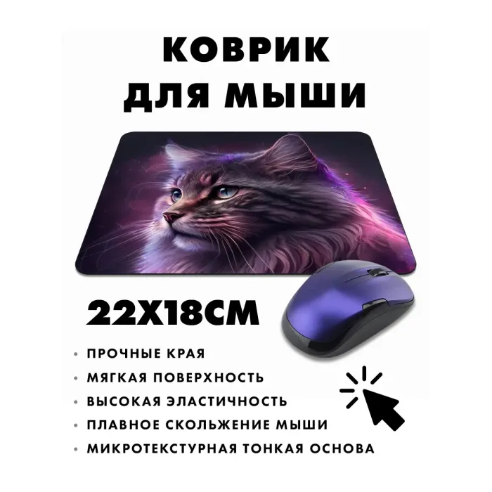 Коврик для мыши с изображением кошки — это не только практичный аксессуар, но и стильный элемент рабочего пространства. Он выполнен из качественного прорезиненного материала, обеспечивающего отличное сцепление с поверхностью стола.