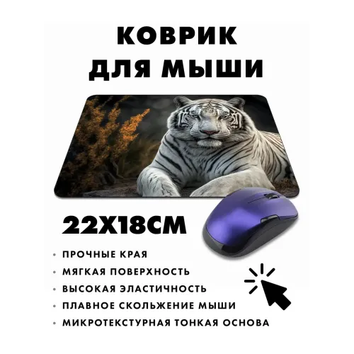Коврик для мыши с изображением белого тигра — это не только практичный аксессуар, но и стильный элемент рабочего пространства. Прорезиненная основа обеспечивает надежное сцепление с поверхностью стола, а размер 22х18 см и толщина 3 мм делают его удобным в использовании.