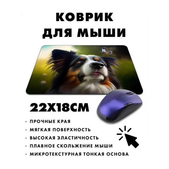 Коврик для мыши с изображением собаки и бабочки — это не просто аксессуар, а стильный элемент рабочего пространства. Он выполнен из прорезиненного материала, что обеспечивает отличное сцепление с поверхностью стола. Размер коврика составляет 22х18 см, а толщина — 3 мм, что делает его удобным в использовании.