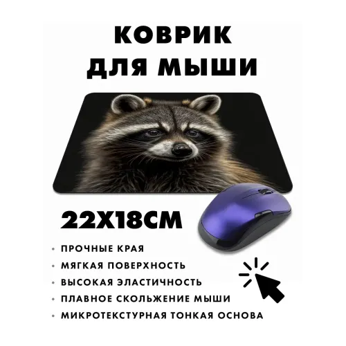 Коврик для компьютерной мыши с изображением енота — это не только практичный аксессуар, но и стильный элемент рабочего пространства. Прорезиненная основа обеспечивает надежное сцепление с поверхностью стола, а размер 22х18 см делает его удобным в использовании.