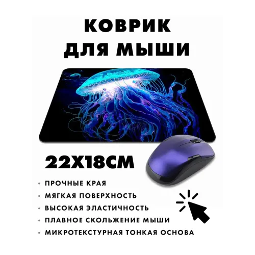 Коврик для мыши с изображением медузы — это не просто аксессуар, а стильное дополнение рабочего пространства. Прорезиненная основа обеспечивает надежное сцепление с поверхностью, а стойкое и четкое изображение добавляет ярких акцентов. Размер коврика составляет 22х18 см при толщине 3 мм, что делает его идеальным выбором для комфортного использования. Хорошее скольжение мышки гарантирует высокую производительность в работе или игре. Этот коврик станет отличным подарком для любителей уникальных вещей и стиля.