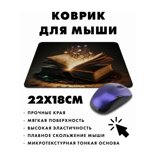Коврик для мыши с изображением "Книга заклинаний" — это не просто аксессуар, а элемент стиля и вдохновения. Прорезиненная основа обеспечивает надежное сцепление с поверхностью, а размеры 22х18 см и толщина 3 мм делают его идеальным для комфортной работы или игры.