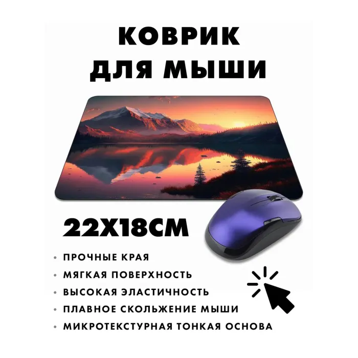 Коврик для мыши — это не просто аксессуар, а элемент стиля рабочего пространства. С изображением горы и озера, он привносит атмосферу природы в повседневную работу. Прорезиненная основа обеспечивает надежное сцепление с поверхностью, а размер 22х18 см делает его идеальным для любого стола.