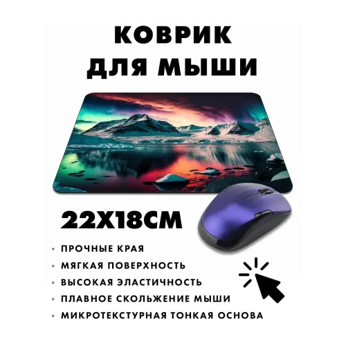 Коврик для мыши с изображением гор и северного сияния привносит в рабочее пространство атмосферу природы и спокойствия. Этот прорезиненный коврик обеспечивает отличное скольжение, что делает работу за компьютером более комфортной. Размер 22х18 см и толщина 3 мм идеально подходят для любого стола. Стойкое, четкое и контрастное изображение добавляет яркости в повседневную рутину. Такой аксессуар станет не только функциональным элементом, но и стильным дополнением интерьера.