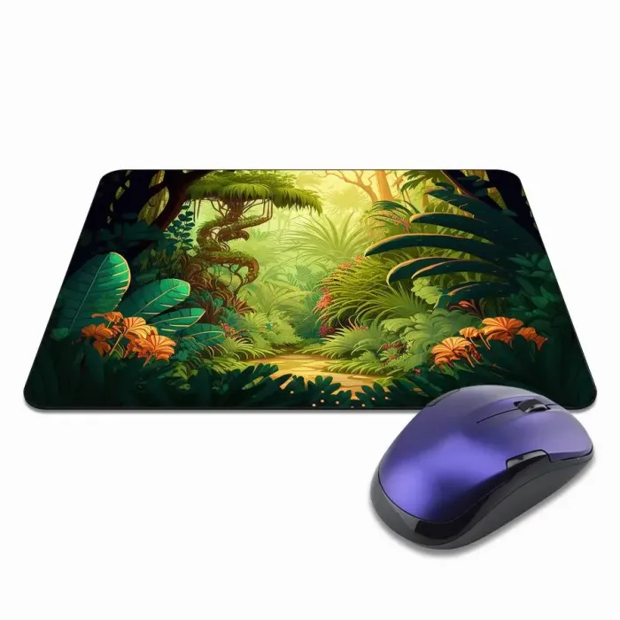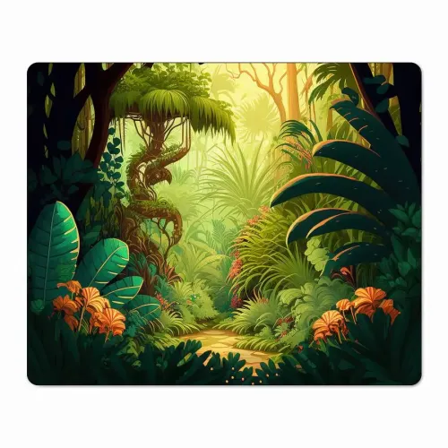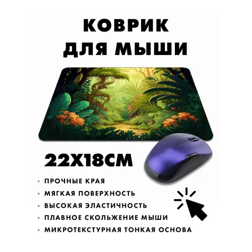 Коврик для мыши с ярким изображением джунглей привнесет атмосферу природы в рабочее пространство. Он выполнен из прорезиненного материала, что обеспечивает отличное сцепление с поверхностью стола и предотвращает скольжение. Размер коврика составляет 22х18 см, а толщина — 3 мм, что делает его удобным в использовании.