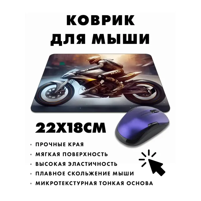 Коврик для мыши с изображением мотоциклиста — это не только практичный аксессуар, но и стильный элемент рабочего пространства. Прорезиненная основа обеспечивает надежное сцепление с поверхностью, а размер 22х18 см и толщина 3 мм делают его удобным в использовании.