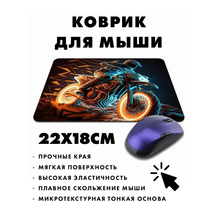Коврик для мыши — это не просто аксессуар, а элемент стиля и комфорта. Прорезиненная основа обеспечивает надежное сцепление с поверхностью, а изображение мотоциклиста добавляет индивидуальности рабочему месту.