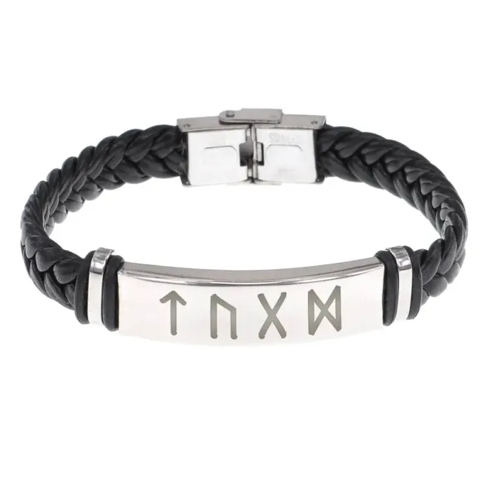 Кожаный рунический браслет с плетёной структурой. В дизайне использованы руны Тейваз, Уруз, Гебо и Дагаз.