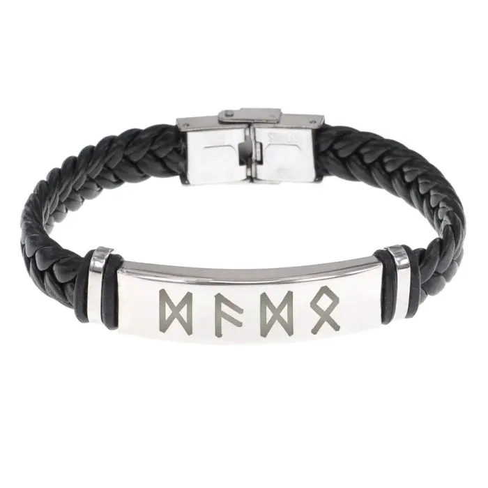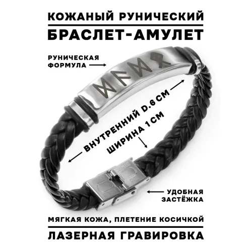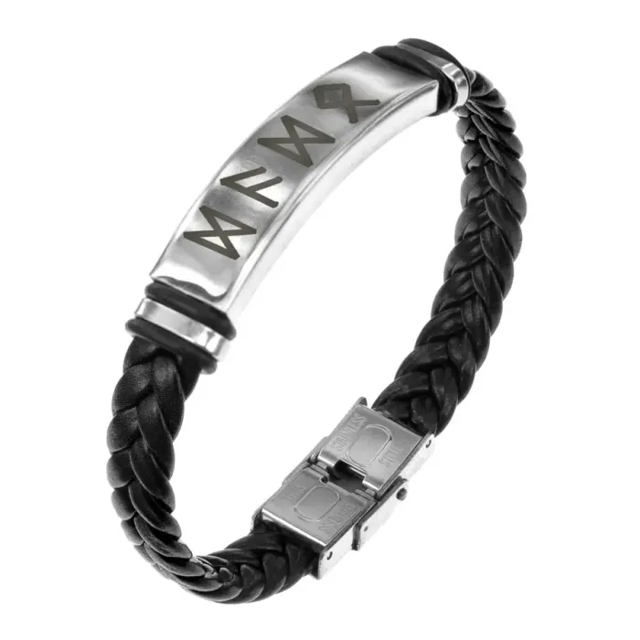 Кожаный браслет с плетёной текстурой, украшенный рунической формулой.