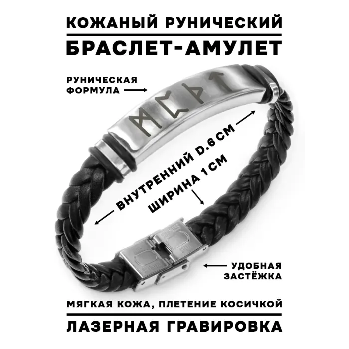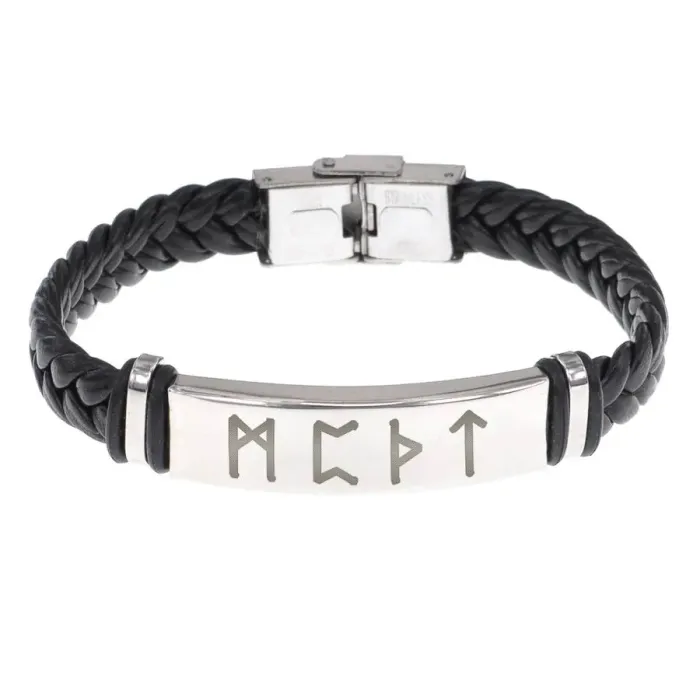 Кожаный рунический браслет с плетёным дизайном и рунической символикой.