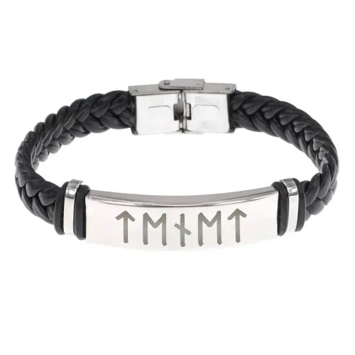 Кожаный рунический браслет с плетёной конструкцией и символами Тейваз, Эваз и Наутиз.