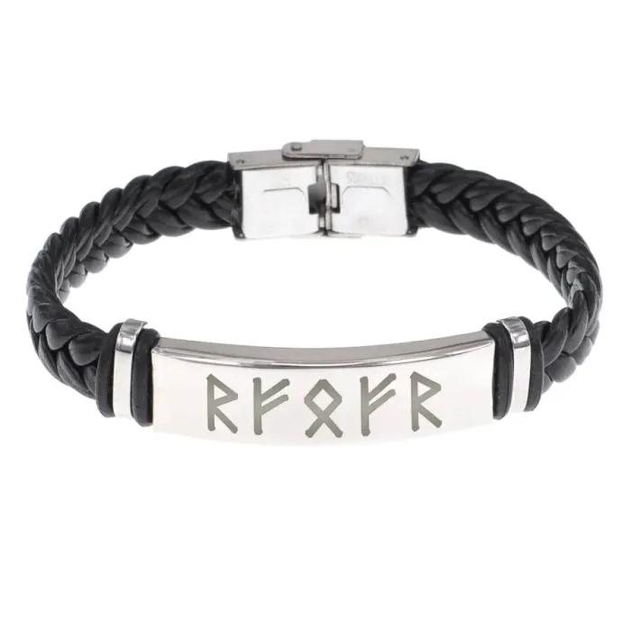Кожаный плетёный браслет с рунической формулой для привлечения богатства.