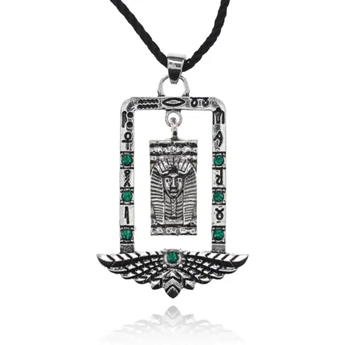 Металлический амулет в виде Фараона с регулируемым шнурком. Имеет покрытие под серебро и декоративные вставки из страз.