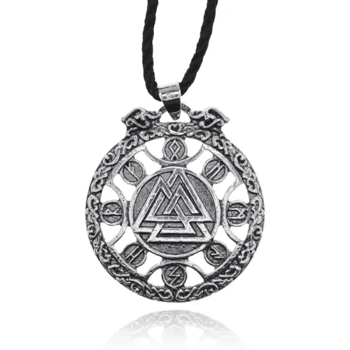Амулет Валькнут — сувенирный аксессуар из металла с покрытием под серебро на регулируемом шнурке.