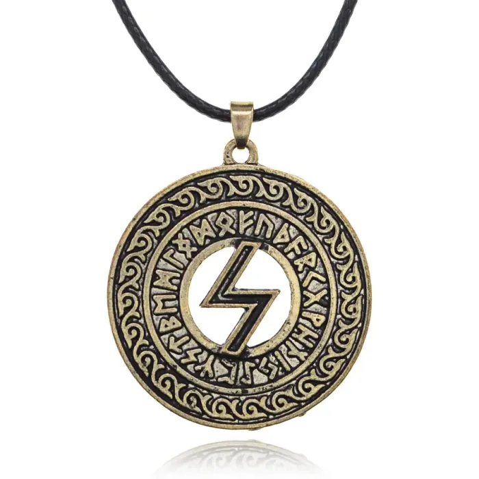 Металлический амулет-подвеска с покрытием под бронзу на регулируемом шнурке.