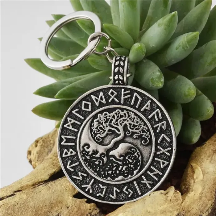 Металлический брелок с дизайном в виде рунического символа Дерево Жизни.