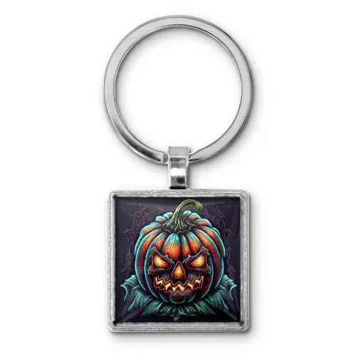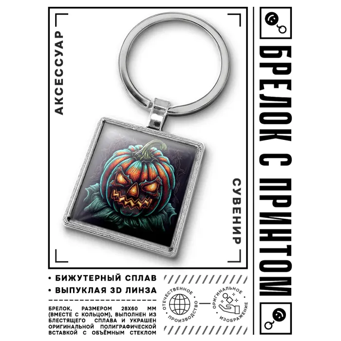 Брелок для ключей в форме тыквы, посвящённый Хэллоуину. Изготовлен из бижутерного сплава с серебристым покрытием, изображение защищено выпуклой стеклянной линзой.