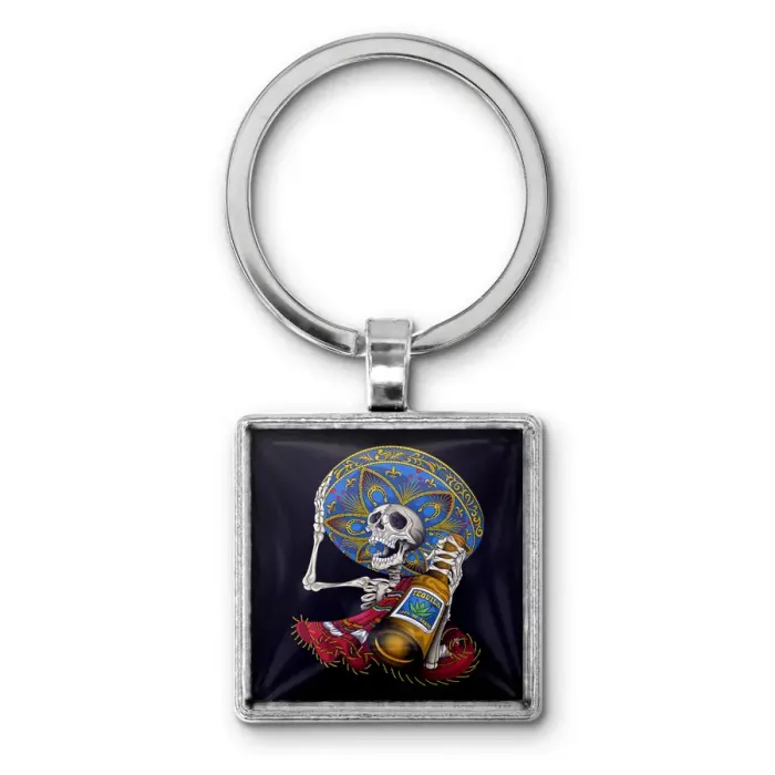Брелок из бижутерного сплава, стали и стекла с изображением скелета в сомбреро.