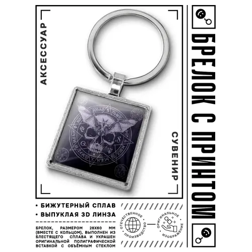 Брелок из бижутерного сплава и стекла с изображением черепа и летучей мыши.
