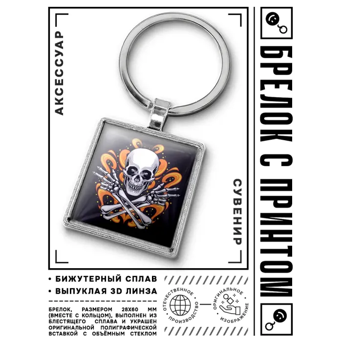 Брелок из бижутерного сплава в виде скелета с изображением под выпуклой стеклянной линзой.