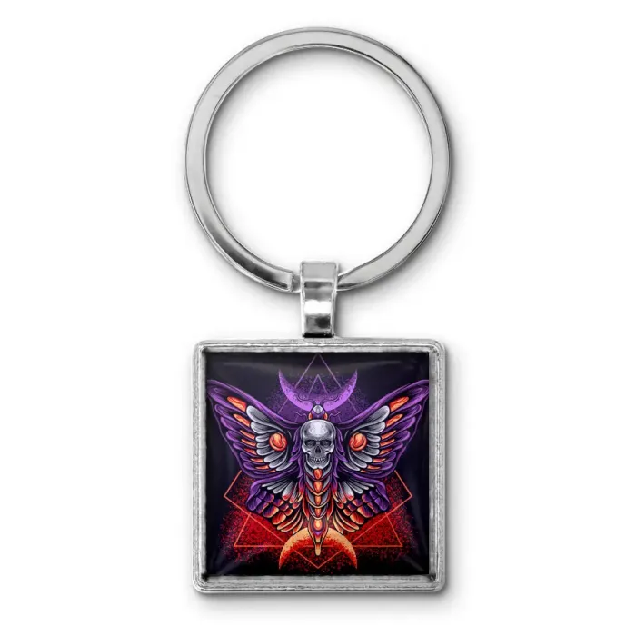 Брелок для ключей из бижутерного сплава в виде мотылька "Мёртвая голова". Изображение защищено выпуклой стеклянной линзой.