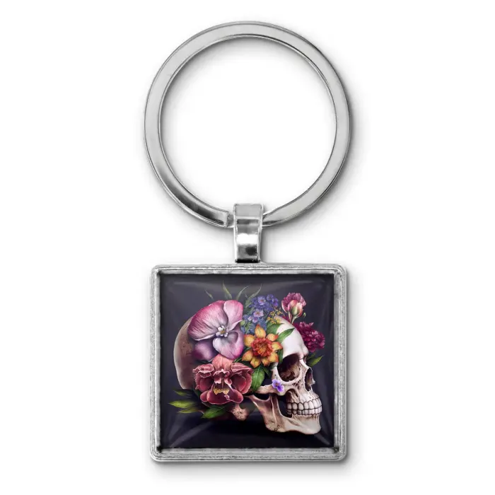 Брелок для ключей или сумки из бижутерного сплава с изображением черепа и цветов под стеклянной линзой.