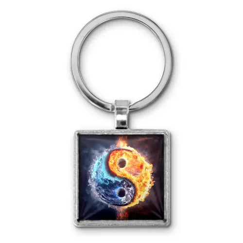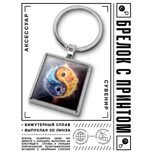 Брелок из бижутерного сплава с изображением символа Инь-Ян и стихий, защищённым стеклянной линзой.