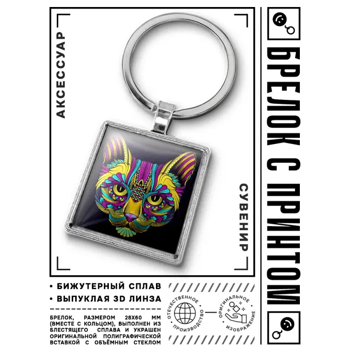 Брелок Кот — стильный и оригинальный аксессуар, который станет отличным дополнением к ключам или сумке. Изготовленный из бижутерного сплава с покрытием под серебро, стали и стекла, он сочетает в себе прочность и элегантность. Размер брелка вместе с кольцом составляет 28х60 мм, а изображение защищено выпуклой стеклянной линзой, что придаёт ему особую выразительность. Упакован в прозрачный пакет, что делает его идеальным вариантом для подарка или сувенира. Этот брелок может стать символом удачи и хорошего настроения благодаря своему милому дизайну.