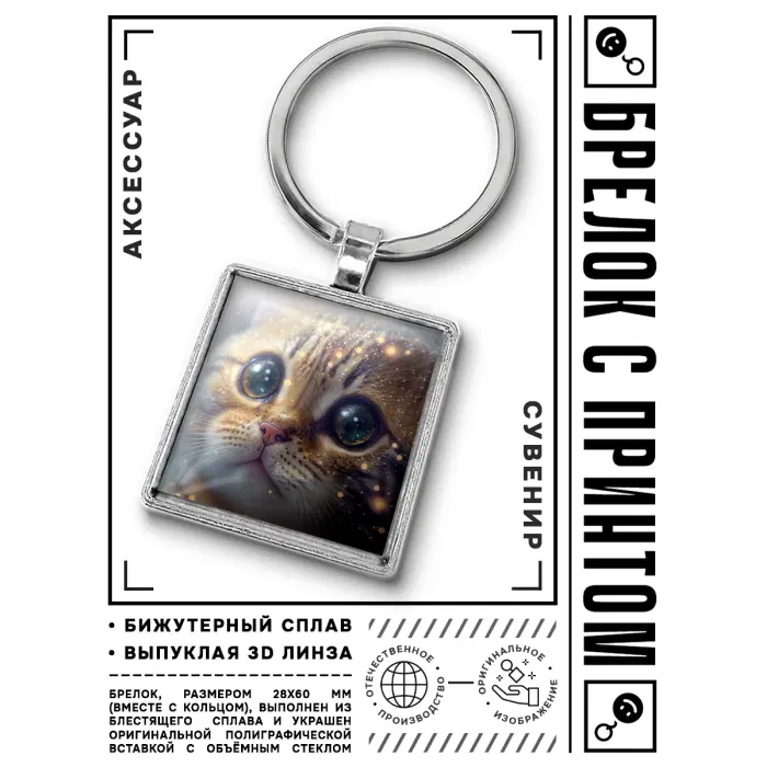 Брелок Котёнок — это очаровательный аксессуар, который станет прекрасным дополнением к ключам или сумке. Изготовленный из бижутерного сплава с покрытием под серебро, стали и стекла, он сочетает в себе стиль и долговечность. Размер брелка вместе с кольцом составляет 28х60 мм, а изображение защищено выпуклой стеклянной линзой, что придаёт ему особую привлекательность.