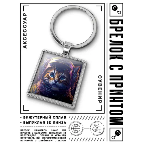 Брелок Кот космонавт — это оригинальный сувенир, который станет ярким акцентом в любом ключнице. Изготовленный из бижутерного сплава с покрытием под серебро и дополненный стальным кольцом, он не только красив, но и прочен. Размер брелка вместе с кольцом составляет 28х60 мм, что делает его удобным для ношения. Защищенное выпуклой стеклянной линзой изображение придает изделию уникальность и стиль. Упаковка в прозрачный пакет позволяет легко подарить его близким или друзьям, добавив немного космической магии в повседневную жизнь.