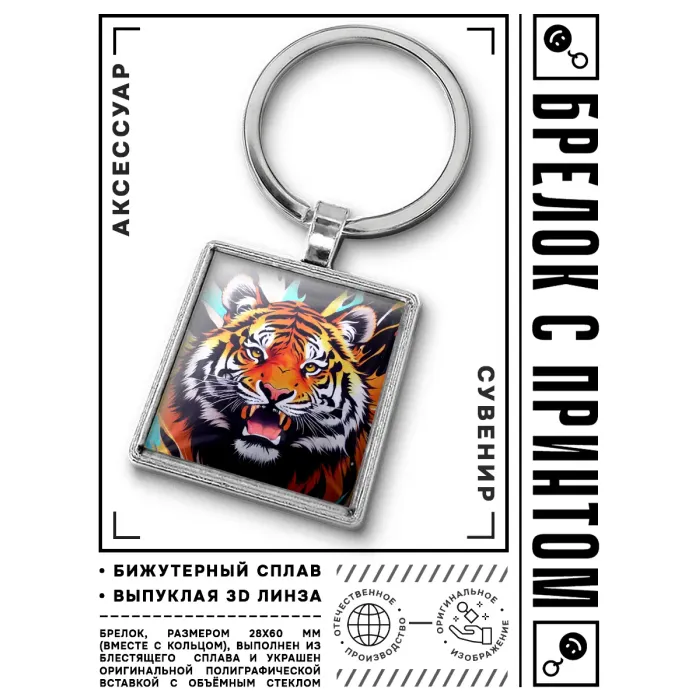 Брелок Тигр — это стильный аксессуар, который станет отличным дополнением к ключам или сумке. Изготовленный из бижутерного сплава с покрытием под серебро, стали и стекла, он сочетает в себе прочность и элегантность. Размер брелка вместе с кольцом составляет 28х60 мм, что делает его компактным и удобным для повседневного использования. Изображение тигра защищено выпуклой стеклянной линзой, что придаёт ему особую выразительность и защиту от повреждений. Такой брелок может стать символом силы и уверенности, а также замечательным подарком для любителей животных.