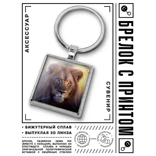 Брелок в виде льва — это стильный аксессуар, который станет отличным дополнением к ключам или сумке. Он символизирует силу и уверенность, что делает его не только практичным, но и значимым подарком. Изготовленный из бижутерного сплава с покрытием под серебро и стали, этот брелок отличается прочностью и долговечностью. Размер изделия вместе с кольцом составляет 28х60 мм, а изображение защищено выпуклой стеклянной линзой для дополнительной защиты. Упакован в прозрачный пакет, что делает его идеальным вариантом для подарка или сувенира.