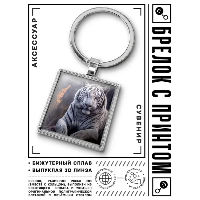 Брелок «Белый тигр» — это стильный аксессуар, который не только украсит ключи, но и станет символом силы и грации. Изготовленный из бижутерного сплава с покрытием под серебро, стали и стекла, он сочетает в себе элегантность и прочность. Размер брелка вместе с кольцом составляет 28х60 мм. Уникальное изображение защищено выпуклой стеклянной линзой, что придаёт дополнительную выразительность этому изделию. Упакован в прозрачный пакет, что делает его отличным вариантом для подарка или сувенира.
