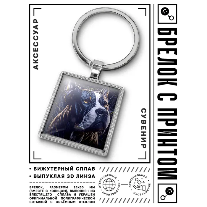 Брелок Питбуль BKG-0068 — стильный аксессуар, который станет отличным дополнением для ключей или сумки. Этот брелок выполнен из бижутерного сплава с покрытием под серебро и стали, что придаёт ему прочность и элегантный вид. Размер изделия вместе с кольцом составляет 28х60 мм, а изображение защищено выпуклой стеклянной линзой, обеспечивая долговечность и яркость цветов. Упаковка в прозрачный пакет делает его идеальным вариантом для подарка или сувенира. Такой брелок будет цениться любителями данной породы собак и станет символом преданности и силы.