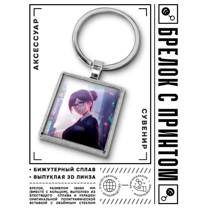 Брелок Аниме девушка в очках — это стильный аксессуар, который станет отличным дополнением для любителей аниме и оригинальных вещей. Он выполнен из бижутерного сплава с покрытием под серебро, стали и стекла, что придаёт ему прочность и элегантность.