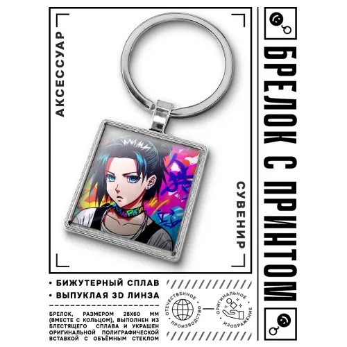 Брелок Аниме девушка граффити — это стильный аксессуар, который станет прекрасным дополнением к ключам или сумке. Он выполнен из бижутерного сплава с покрытием под серебро и стали, что обеспечивает долговечность и привлекательный внешний вид. Изображение украшено выпуклой стеклянной линзой, защищающей его от повреждений и придающей яркость. Размер брелка вместе с кольцом составляет 28х60 мм, что делает его компактным и удобным в использовании. Упакован в прозрачный пакет, идеально подходит для подарка или личного использования.