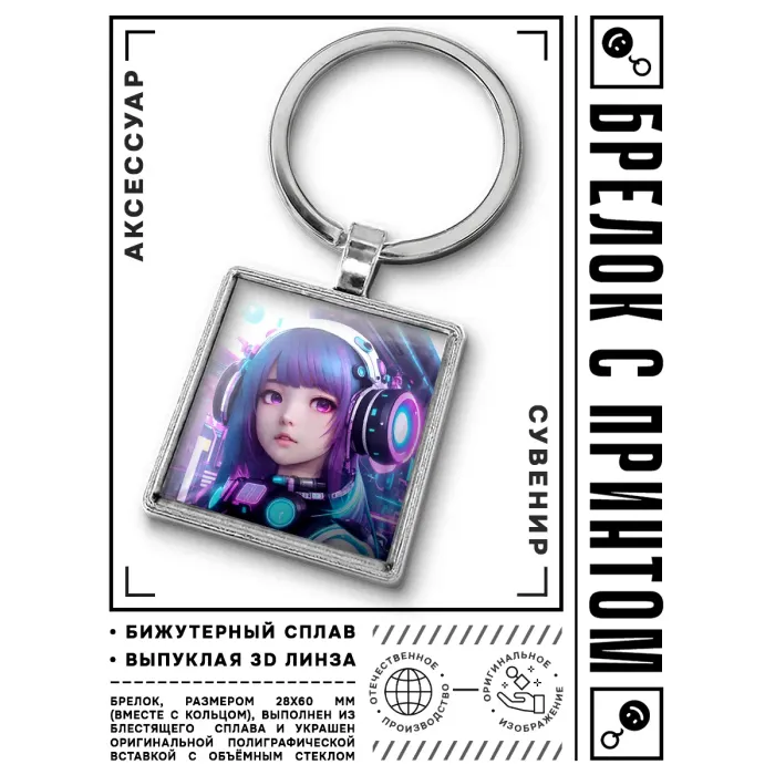 Брелок Киберпанк девушка — стильный аксессуар, который добавит оригинальности любому ключу или сумке. Этот предмет искусства выполнен из бижутерного сплава с покрытием под серебро, стали и стекла, что обеспечивает его долговечность и привлекательный внешний вид. Размер брелка вместе с кольцом составляет 28х60 мм, а изображение защищено выпуклой стеклянной линзой, что придаёт ему особую выразительность. Упакован в прозрачный пакет для удобства хранения и подарка.
