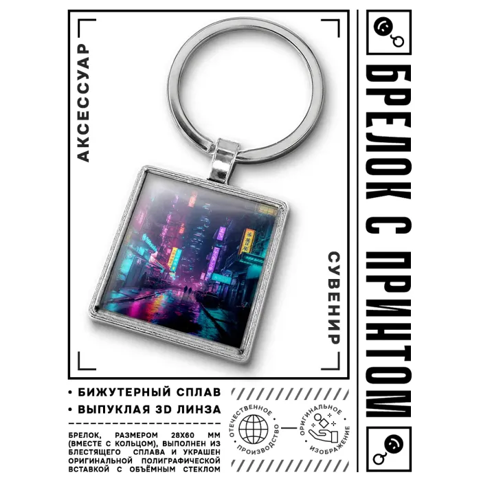 Брелок Киберпанк Неон Улица — это стильный аксессуар, который добавит ярких красок в повседневную жизнь. Он символизирует атмосферу футуристического мира и станет отличным подарком для любителей киберпанка.