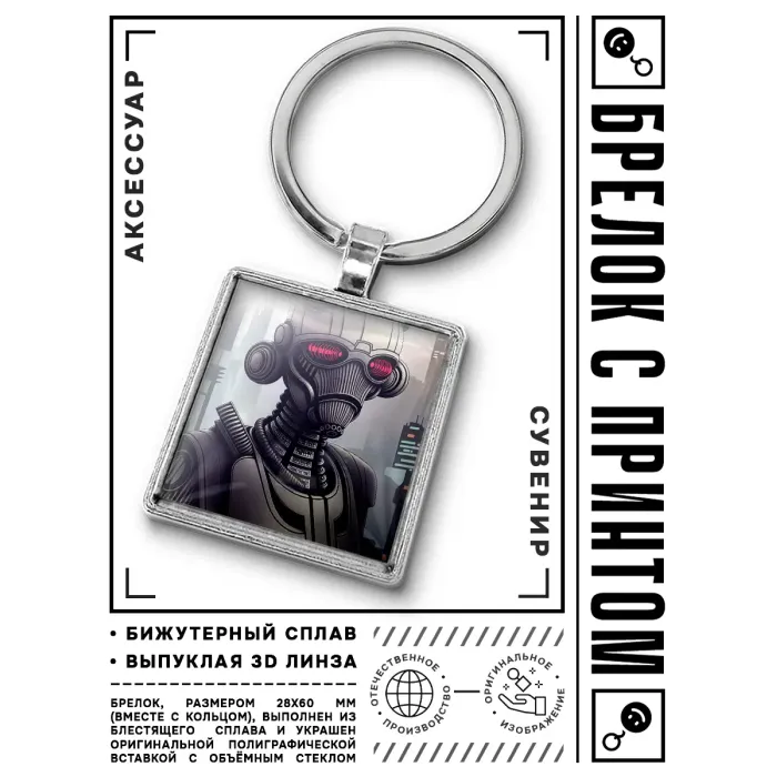 Брелок Киберпанк Робот BKG-0159 — стильный аксессуар, который станет отличным дополнением к ключам или рюкзаку. Этот уникальный брелок выполнен из бижутерного сплава с покрытием под серебро, стали и стекла, что придаёт ему особую прочность и привлекательность. Размеры брелка вместе с кольцом составляют 28х60 мм, а изображение защищено выпуклой стеклянной линзой, что обеспечивает его долговечность и яркость. Упакован в прозрачный пакет, этот брелок может стать оригинальным подарком для любителей киберпанка и футуристического дизайна.