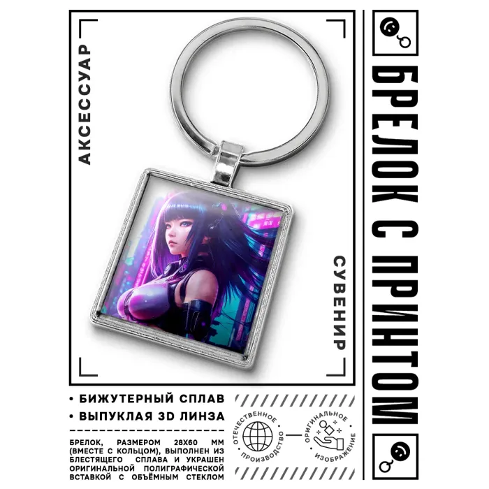 Брелок Киберпанк девушка — стильный аксессуар, который добавит нотку футуризма в повседневную жизнь. Изготовленный из бижутерного сплава с покрытием под серебро и стали, он сочетает в себе прочность и элегантность. Размер брелка вместе с кольцом составляет 28х60 мм, а изображение защищено выпуклой стеклянной линзой, что обеспечивает долговечность и яркость цветов. Упакован в прозрачный пакет, этот брелок станет отличным подарком или оригинальным дополнением к ключам или сумке.