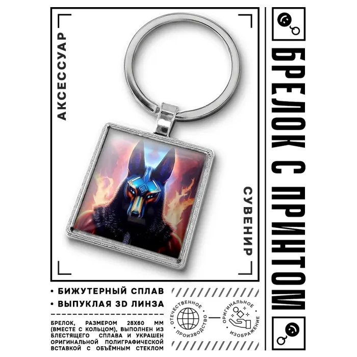 Брелок Анубис — это стильный аксессуар, который сочетает в себе элементы древнеегипетской культуры и современный дизайн. Этот брелок выполнен из бижутерного сплава с покрытием под серебро, стали и стекла, что придаёт ему прочность и элегантность. Размеры изделия составляют 28х60 мм вместе с кольцом, а изображение защищено выпуклой стеклянной линзой, что делает его ярким акцентом на ключах или сумке.