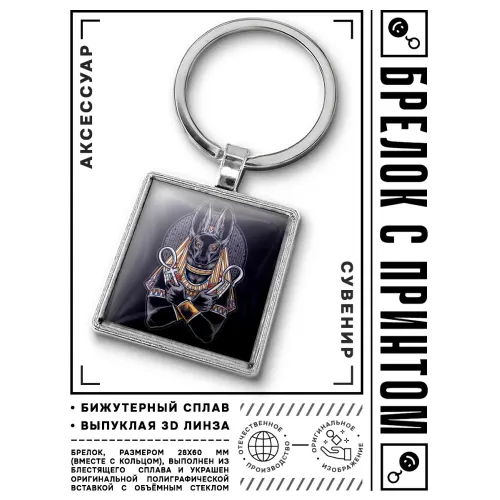 Брелок Анубис — это уникальный аксессуар, который сочетает в себе стиль и символику древнеегипетской культуры. Он станет отличным подарком для ценителей мифологии и истории. Изготовленный из бижутерного сплава с покрытием под серебро, стали и стекла, этот брелок не только красив, но и прочен.