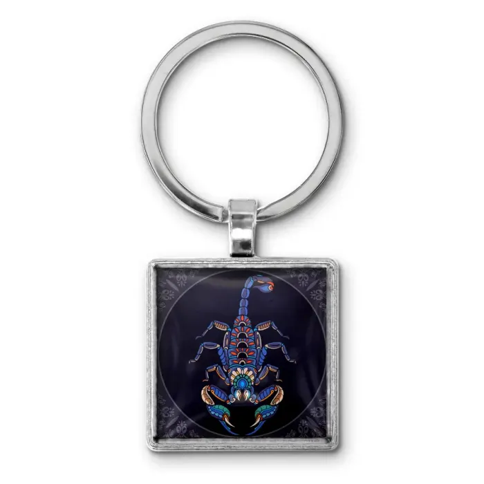 Брелок для ключей из бижутерного сплава и стали со стеклянной линзой и изображением скорпиона.