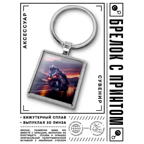 Брелок Мотоциклист — стильный аксессуар, который станет отличным подарком для любителей мотоциклов и активного образа жизни. Этот брелок выполнен из бижутерного сплава с покрытием под серебро и дополнен элементами из стали и стекла, что придаёт ему элегантный вид.
