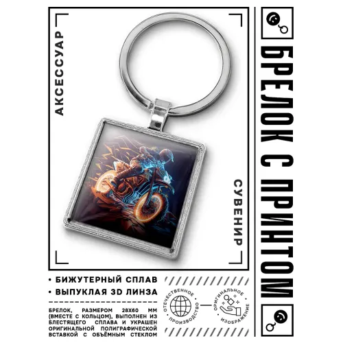 Брелок Мотоциклист — стильный аксессуар, который станет отличным дополнением к ключам или рюкзаку. Изготовленный из бижутерного сплава с покрытием под серебро и стали, он отличается прочностью и долговечностью. Размер брелка вместе с кольцом составляет 28х60 мм, что делает его компактным и удобным в использовании. Изображение защищено выпуклой стеклянной линзой, придающей изделию особую элегантность. Упакован в прозрачный пакет, что делает его идеальным вариантом для подарка или сувенира.