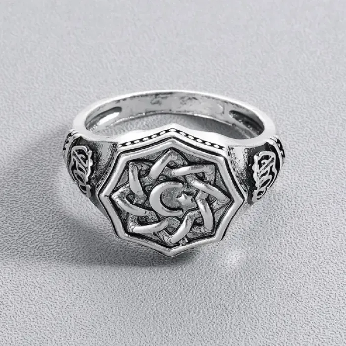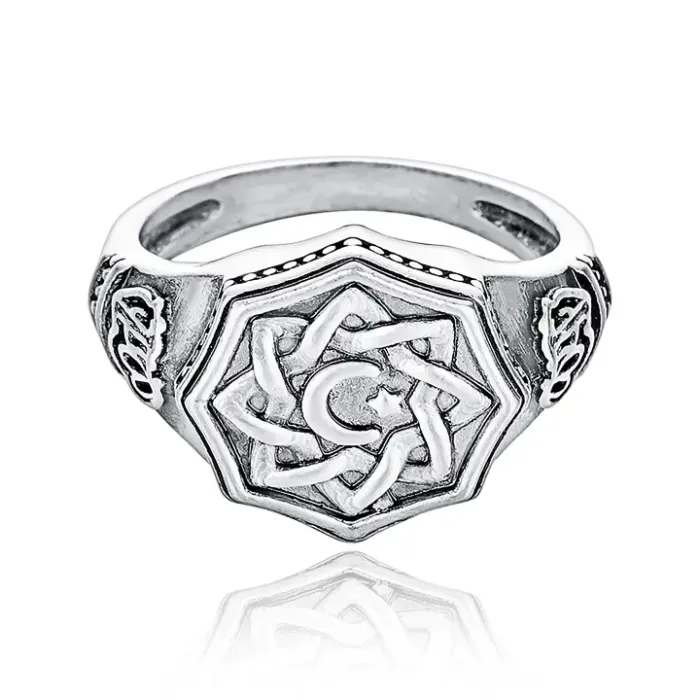 Кольцо с дизайном звезды и полумесяца. Материал — металл с покрытием под серебро.