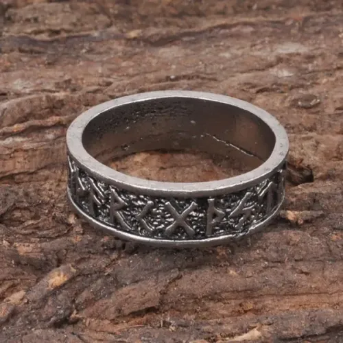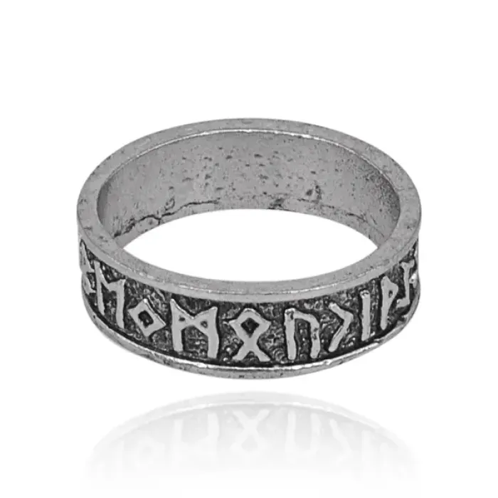 Металлическое кольцо с руническим дизайном и покрытием под серебро.